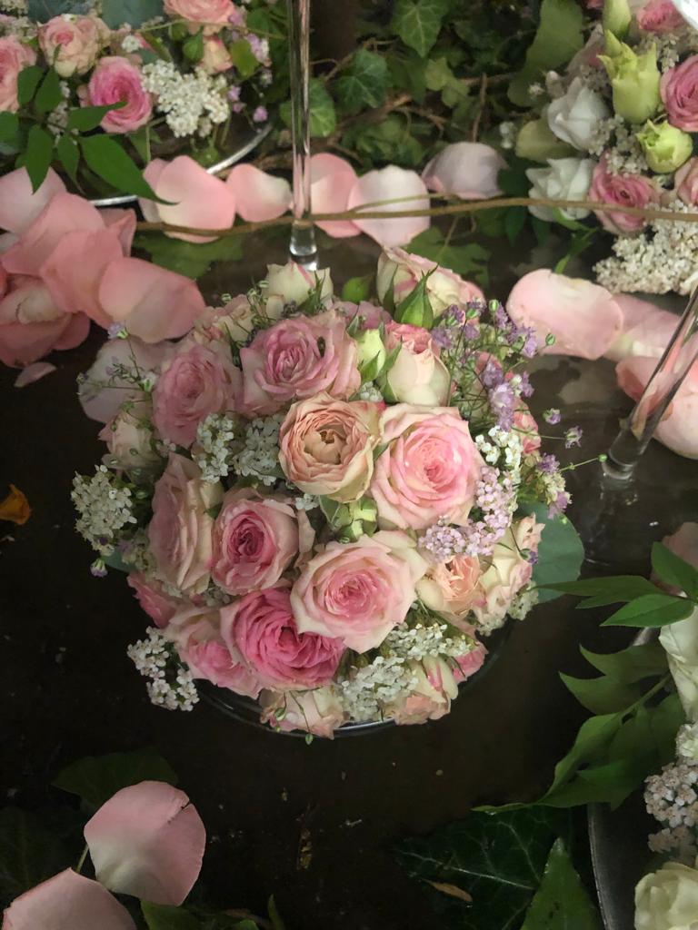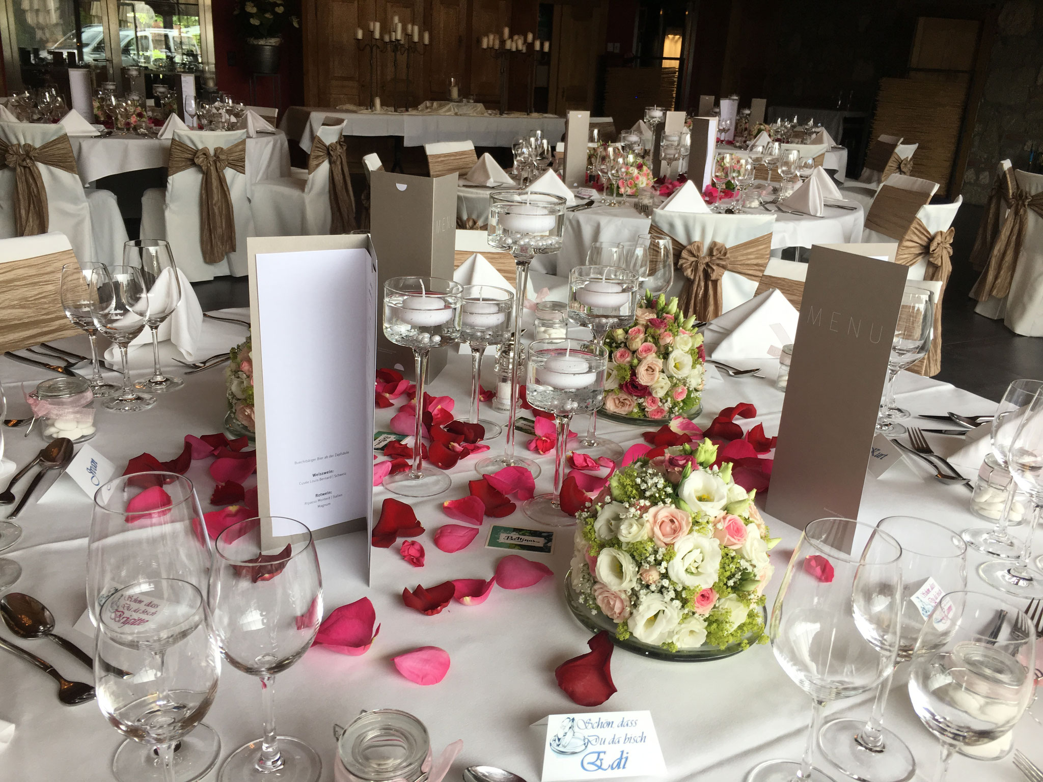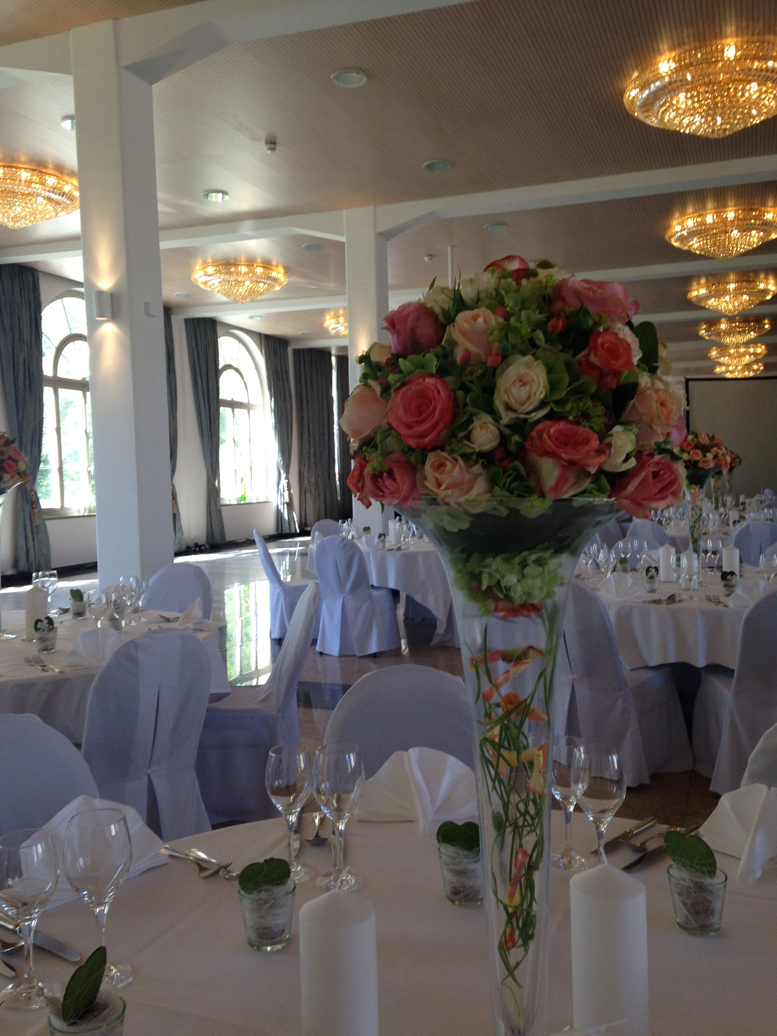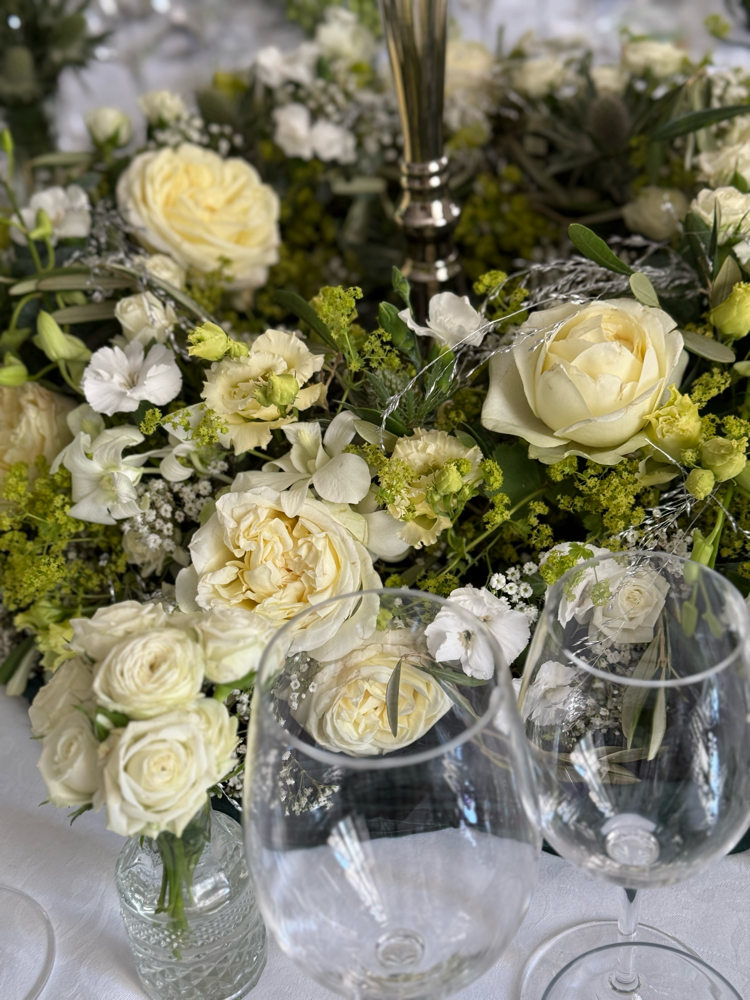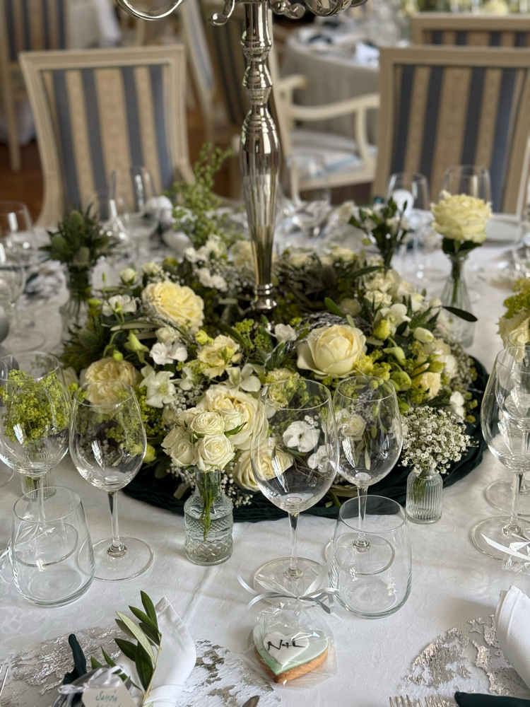 Perfekt abgestimmte Blumenarrangements lassen jede Hochzeitstafel festlich erstrahlen und schaffen ein feierliches Ambiente.