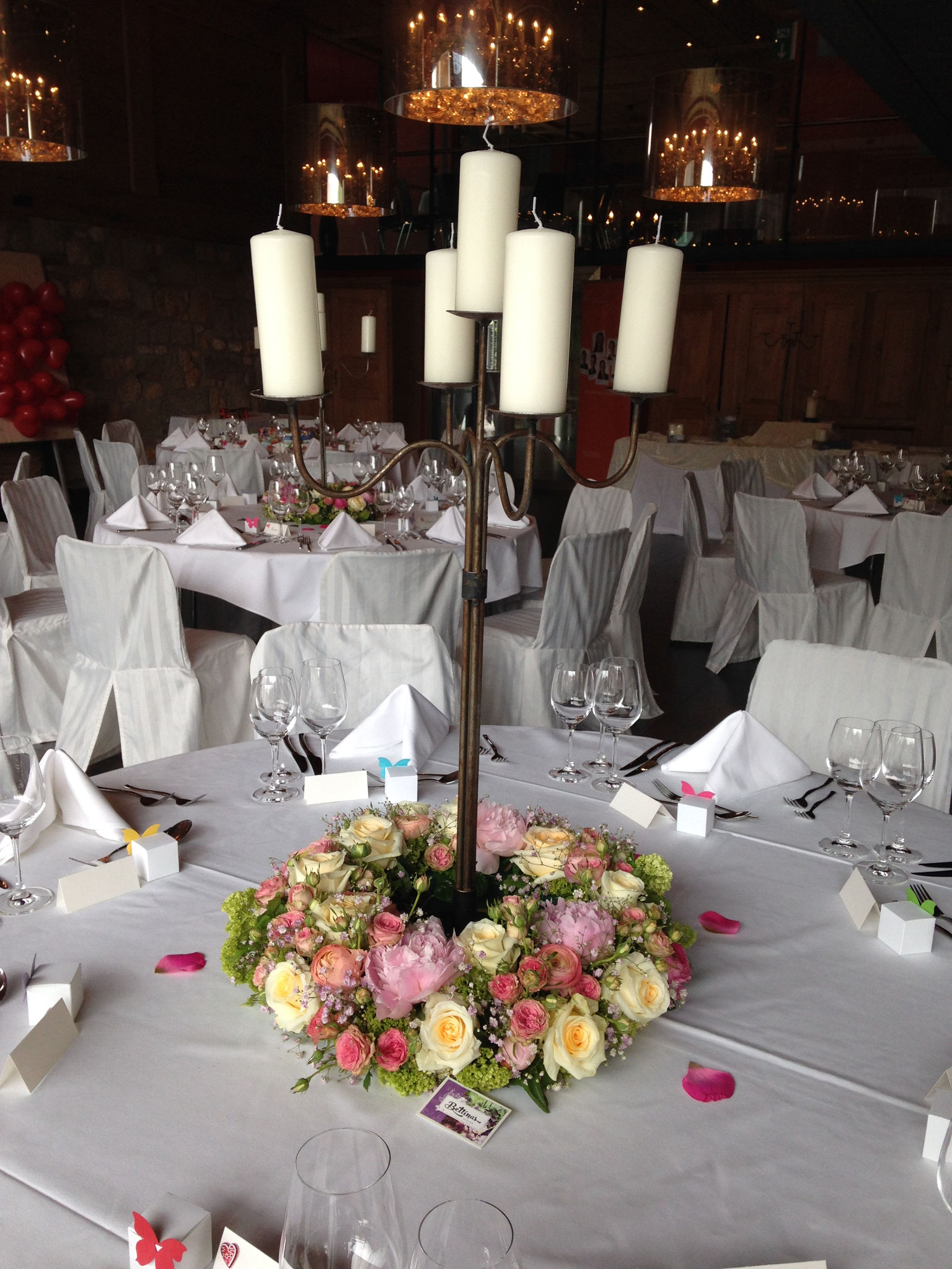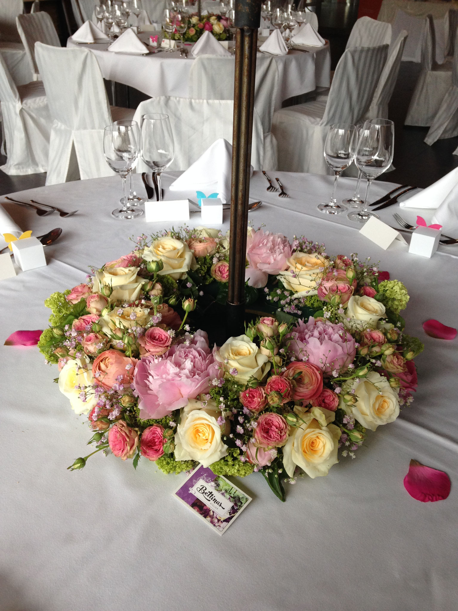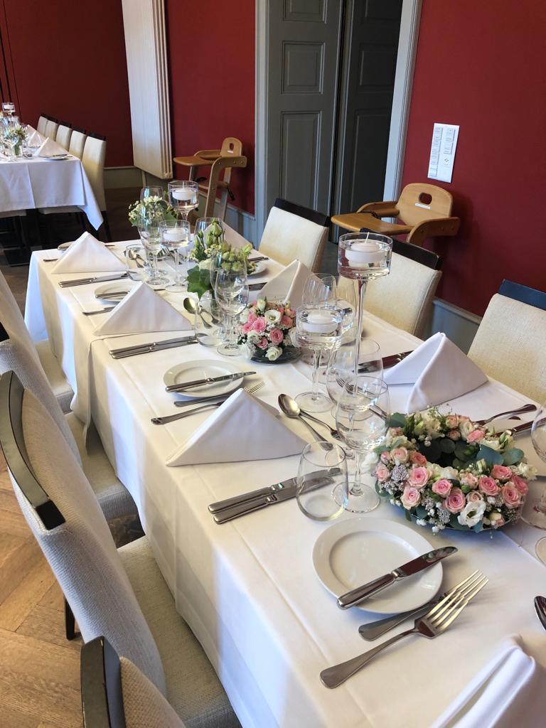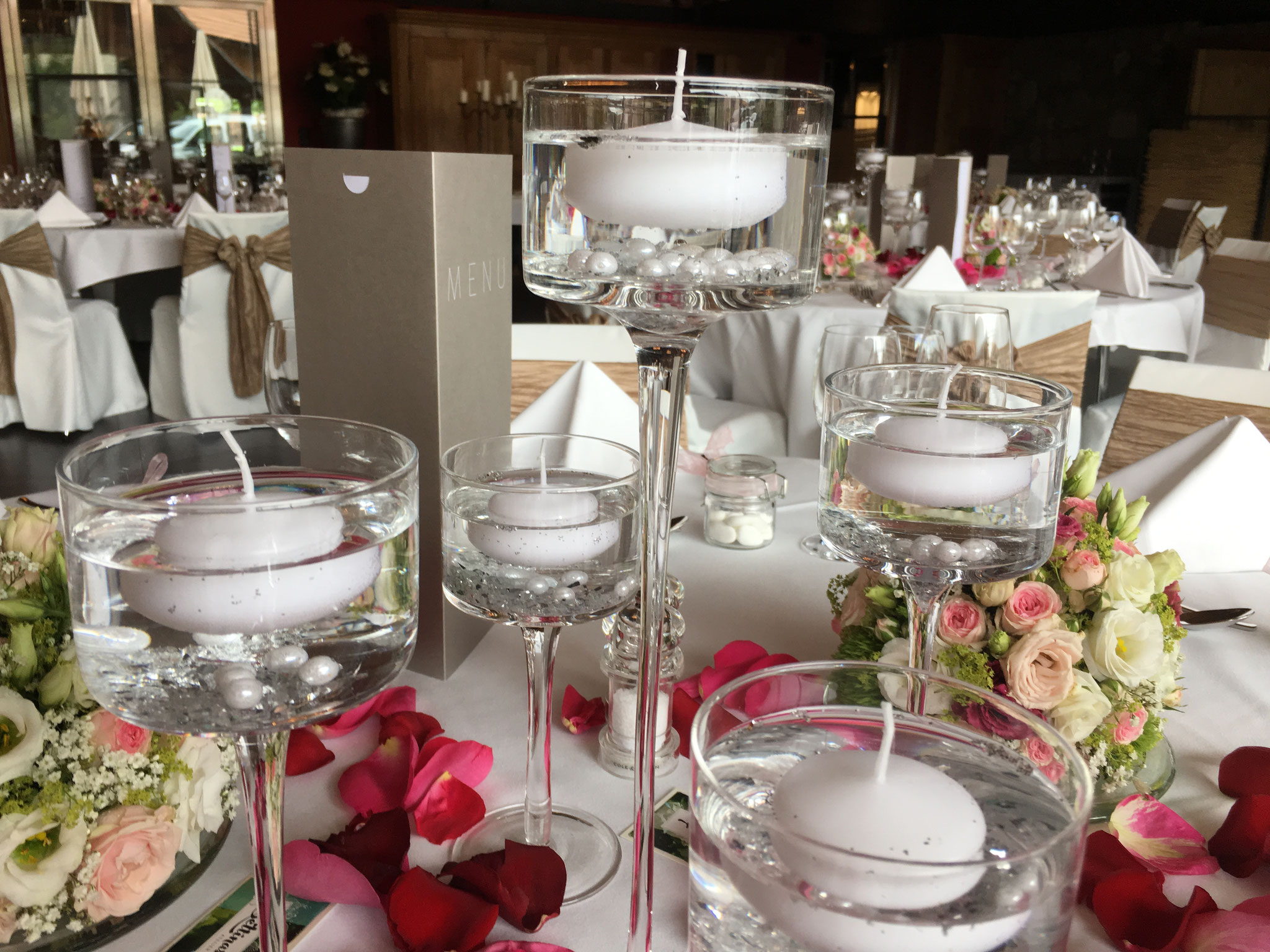 Perfekt abgestimmte Blumenarrangements lassen jede Hochzeitstafel festlich erstrahlen und schaffen ein feierliches Ambiente.